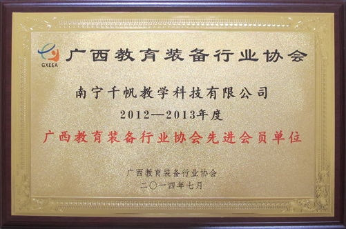 南寧千帆教學(xué)科技有限公司榮獲廣西教育裝備行業(yè)協(xié)會授予“2012-2013年度廣西教育裝備行業(yè)協(xié)會先進會員單位”稱號。