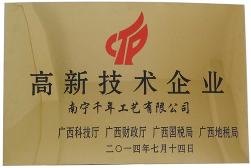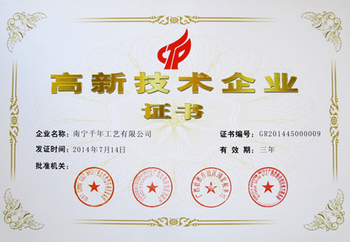 (本網(wǎng)訊) 熱烈慶祝集團公司------千年工藝獲得了由廣西科技廳、廣西財政廳、廣西國稅局、廣西地稅局聯(lián)合頒發(fā)的“高新技術企業(yè)證書”,成為廣西2014年首批國家級高新技術企業(yè)之一。